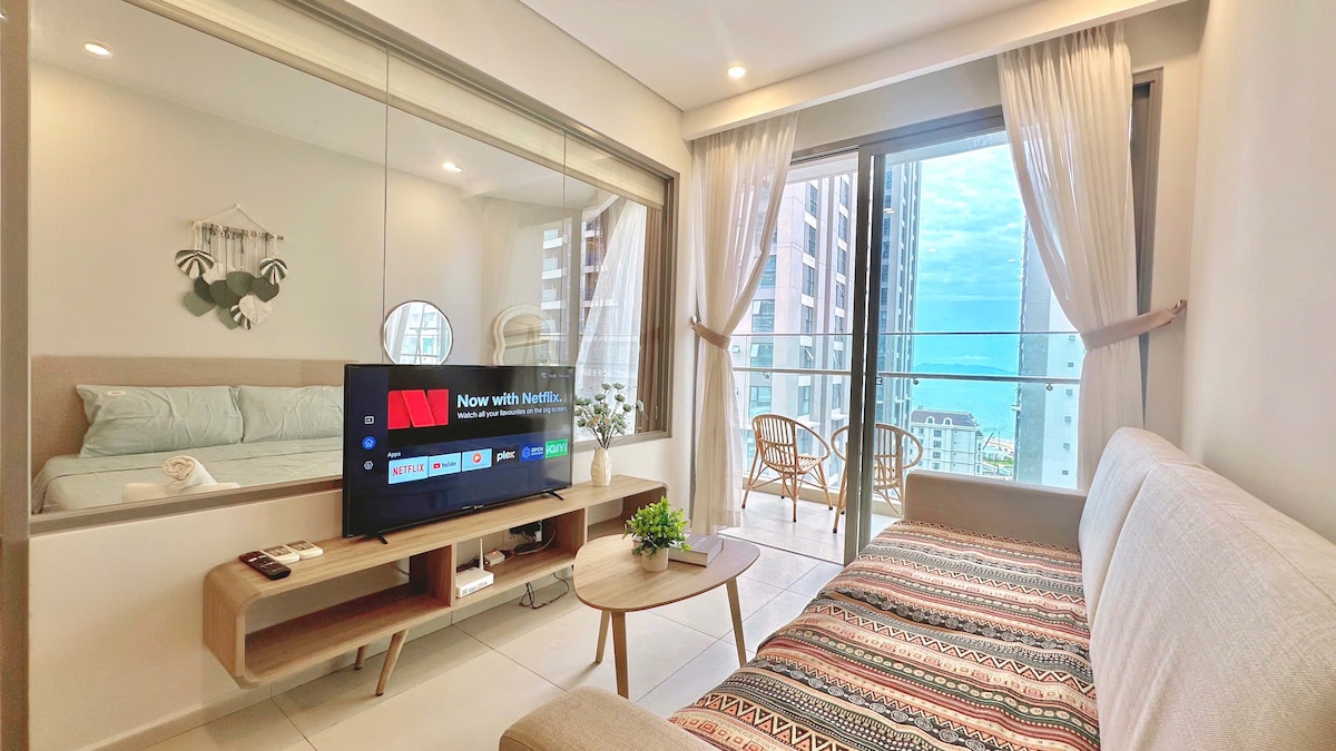 * A0502 Appartement 5e étage Block A. Design standard, décoration agréable, spacieux, propre, équipements complets et confortables. Belle vue sur la mer panoramique et le complexe hôtelier. À seulement 2 minutes à pied de la plage privée, de la piscine, de la salle à manger extérieure du complexe. *Location bon marché, nombreuses incitations. Obtenez un loyer longue durée. - Appartement : 90m2. Salon, grandes chambres. Salle à manger et cuisinière confortables, entièrement approvisionnées. - 2 chambres privées Lit1m8-2m. Matelas Kymdan Premium, 20cm d'épaisseur, moelleux. Le musée est large, propre. *Venez adorer. Eh bien, ce sera amusant