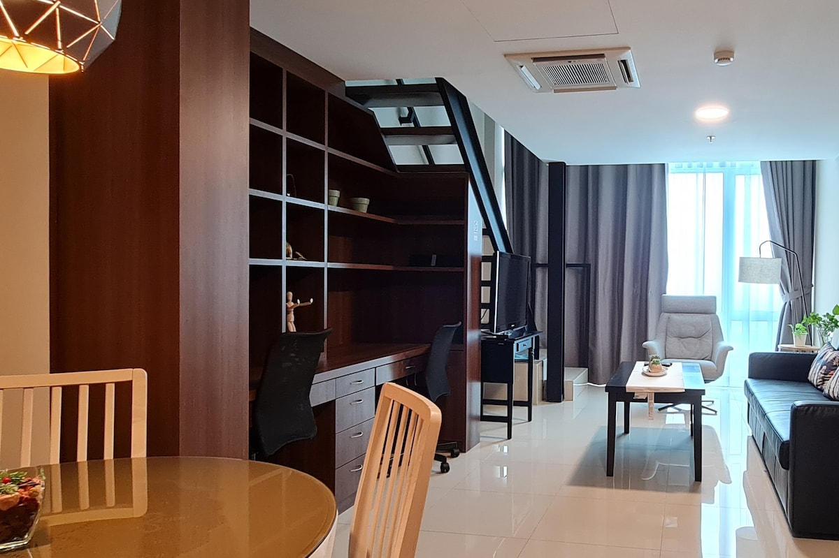 L'appartement est situé au centre-ville de Lippo Village, une banlieue sereine de Jakarta, avec l'université Pelita Harapan à côté de ses portes. Attaché à Supermal Karawaci, l'un des plus grands centres commerciaux de la région, il est très pratique de faire des courses, de dîner ou de socialiser aussi. Le logement lui-même situé en haut étage orienté est, donnant sur l'Université, bien meublé avec un éclairage d'ambiance approprié. Nous avons un chauffe-eau, une cuisine entièrement fonctionnelle et un téléviseur avec un service local.
