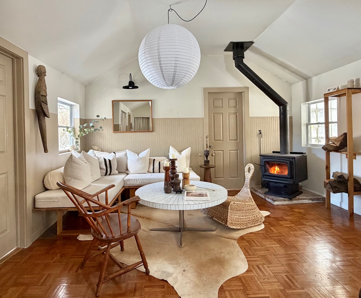 Profitez d'un séjour paisible dans cet espace confortable et créatif. Situé sur 10 acres de jardins et de bois, ce chalet est parfaitement situé pour explorer l'ouest du Massachusetts, avec des endroits comme MASS MoCA, Shelburne Falls, Tanglewood et Northampton, tous à moins de 30 minutes à 1 heure de route. À l'étage, il y a un lit Queen Size et une salle de bain complète, tandis qu'en bas, il y a une cuisine fonctionnelle, un bureau, de grandes fenêtres et un espace de vie avec un canapé-lit complet. Nous vivons dans la maison principale sur la propriété, mais respectons votre vie privée - voir les photos !