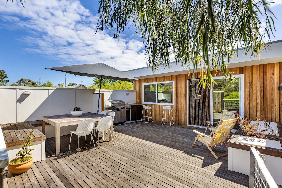 Accédez à la plage ou au centre-ville en 4 minutes en voiture depuis ce studio calme et confortable. Écoutez les oiseaux chanter en vous réveillant avec votre panier de petit-déjeuner fourni à l'arrivée. Les produits locaux comprennent du muesli Adelia, du pain au levain, du beurre LardAss, de l'eau gazeuse, du jus, du lait et de la confiture. Détendez-vous l'après-midi dans votre salon confortable ou dans l'espace extérieur avec un vin local que vous avez choisi lors de vos aventures. Lors des soirées plus fraîches, profitez de la chaleur de votre foyer extérieur.