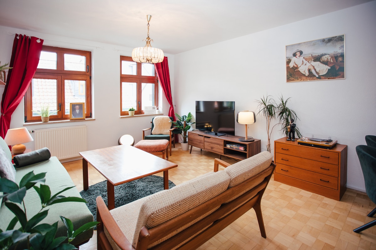 Charmant duplex au cœur de Wernigerode. L'appartement se trouve au 4ème étage d'un bâtiment classé et offre une vue magnifique sur la ville environnante et le Brocken. L'appartement dispose d'une cuisine entièrement équipée, d'un salon confortable, de 2 chambres confortables avec 2 salles de bains, de 2 téléviseurs et est idéal pour les couples, les amis ou la famille. Asseyez-vous et profitez de votre séjour. Nous sommes impatients de vous accueillir !