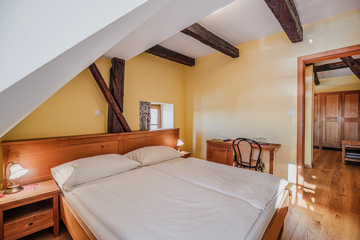 The room is suitable for one or two persons. The bed, size 160 x 200 cm, is distinguished by a quality mattress for a comfortable sleep. Oiled, solid cherry furniture, fully preserved original beams, high-quality carpeting, stylish lamps and door handles evoke a touch of tradition. The bathroom has a shower, sink, toilet, hairdryer and accessories for personal hygiene. Air conditioning, heating, CATV-flat-screen TVs and free WIFI. Pets are not allowed.
