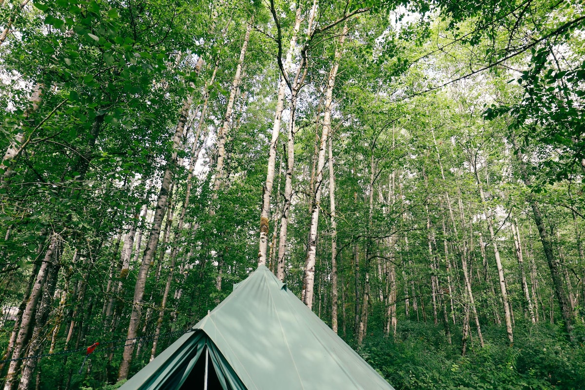 Venez planter votre tente pour un séjour mémorable dans notre ferme hors réseau. Marchez jusqu'à notre ruisseau, détendez-vous dans le champ ensoleillé, promenez-vous dans les bois. Vous n'êtes qu'à quelques minutes de Birch Bay et Blaine, des pizzas peuvent vous être livrées directement, il y a de la nature tout autour pour vous détendre et vous amuser avec toutes les offres de notre région. Nos tentes dans les bois à l'arrière de notre ferme offrent un endroit paisible pour se reposer entre les aventures.