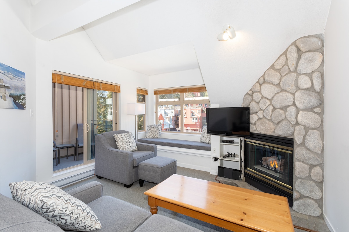 Appartement d'une chambre au dernier étage à Whistler Village avec des fenêtres du sol au plafond et une vue imprenable sur la montagne. Le logement confortable de 400 pieds carrés dispose d'un lit queen dans la chambre, d'une cuisine complète, d'un canapé convertible dbl dans le salon, d'un balcon et d'une cheminée à gaz ; parfait pour un couple ou une jeune famille, mais il est trop petit pour quatre adultes. Le sauna et la salle de sport sont ouverts toute l'année. La piscine extérieure ferme le 1er octobre de chaque année. Jacuzzi, piscine et ascenseur fermés pour rénovation : du 7 avril au 15 juillet 2026, prix réduits en conséquence