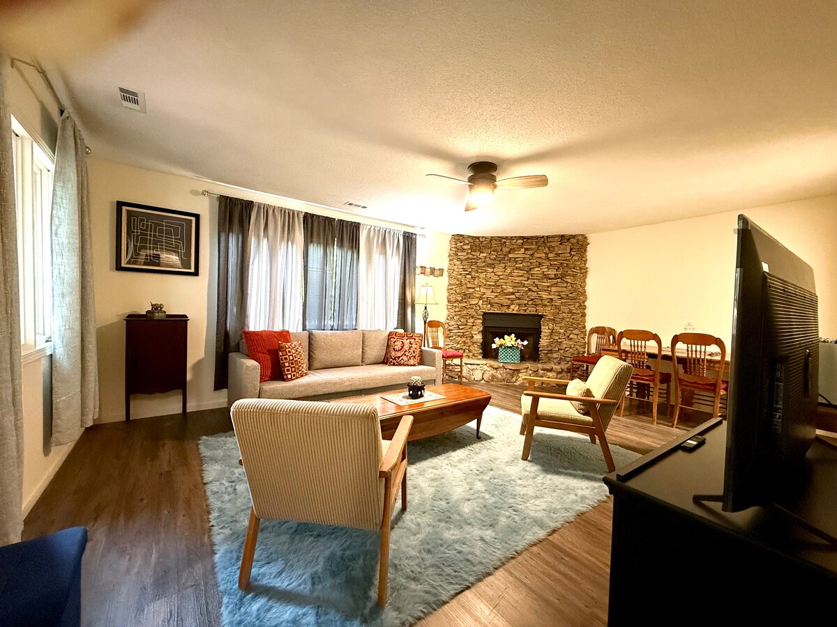 - Walk to Shops and Restaurants - First-floor unit with no interior stairs and easy access - Free parking - Newly renovated with upscale finishes and thoughtful touches - Cozy living area with a fireplace - 75-inch Smart TV for movie nights - Egyptian cotton sheets and quality linens - Fully equipped kitchen for cooking and entertaining - Private patio for relaxing outdoors - Perfect for families, couples, or friends