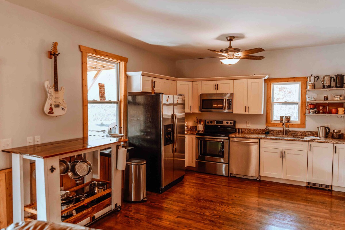 Bryson City est la porte d'entrée des montagnes Great Smoky. Ce nouveau chalet moderne de 2 chambres, 2 salles de bain avec vue sur la montagne est à seulement 7 minutes du centre-ville de Bryson City. Cet espace a été soigneusement équipé avec des équipements conçus pour en faire votre maison loin de chez vous avec un jacuzzi, un foyer extérieur et une connexion Wi-Fi (Starlink). Bryson City n'a pas été significativement touchée par l'ouragan Helene. Visiter la ville, les sentiers de randonnée, les cascades et les communautés de montagne environnantes signifie beaucoup pour l'ouest de la Caroline du Nord.