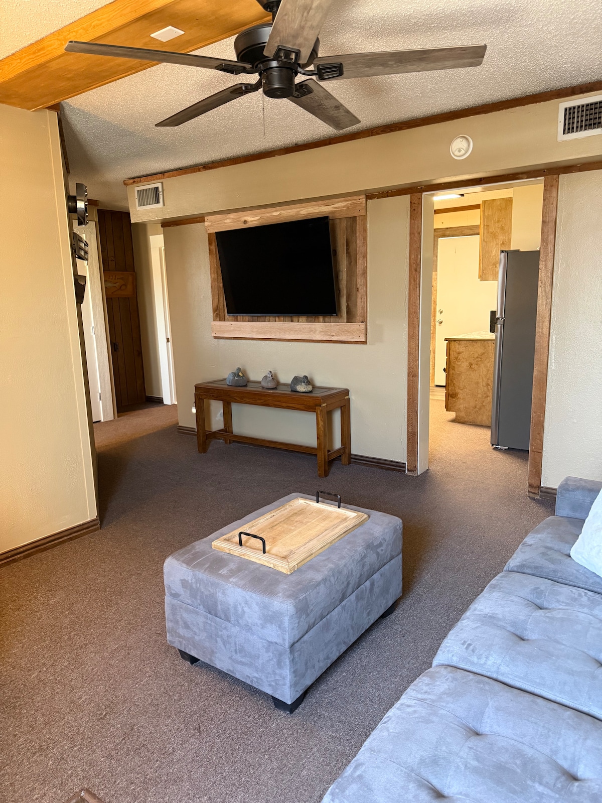 Enjoy your stay in this secluded 2 bedroom, 1 1/2 bathroom camper. This camper can sleep up to 6 guests comfortably. An Arctic package upgrade allows you to stay toasty on those winter nights & an AC to keep you cool in the summer. A fully equipped kitchen will have you skipping those Allsups burritos for a home cooked meal. The tankless water heater allows for on demand hot water. This camper is large enough to provide enough space for your entire family to relax and unwind.