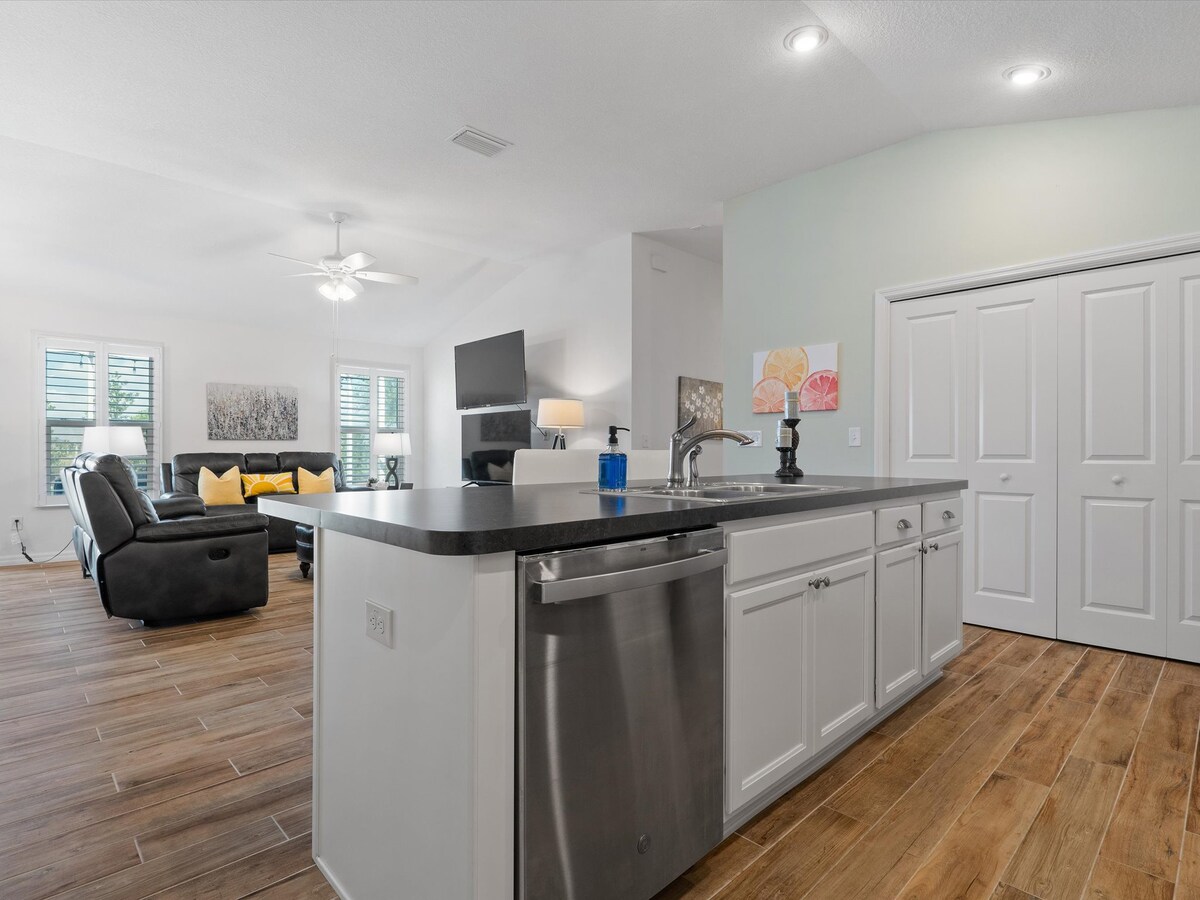 Cette maison est située à quelques minutes de Sawgrass Grove où vous pourrez profiter de divertissements nocturnes. À seulement 2 minutes en voiturette de golf de la piscine pour adultes, et la voiturette de golf est incluse ! 2 chambres avec lits King Size et une 3e chambre avec un lit double et un espace de travail. Lanai orienté vers l'ouest pour le café du matin et les couchers de soleil du soir avec un verre de vin ! Téléviseurs intelligents grand écran, barbecue et tout ce dont vous avez besoin pour vous sentir comme chez vous.