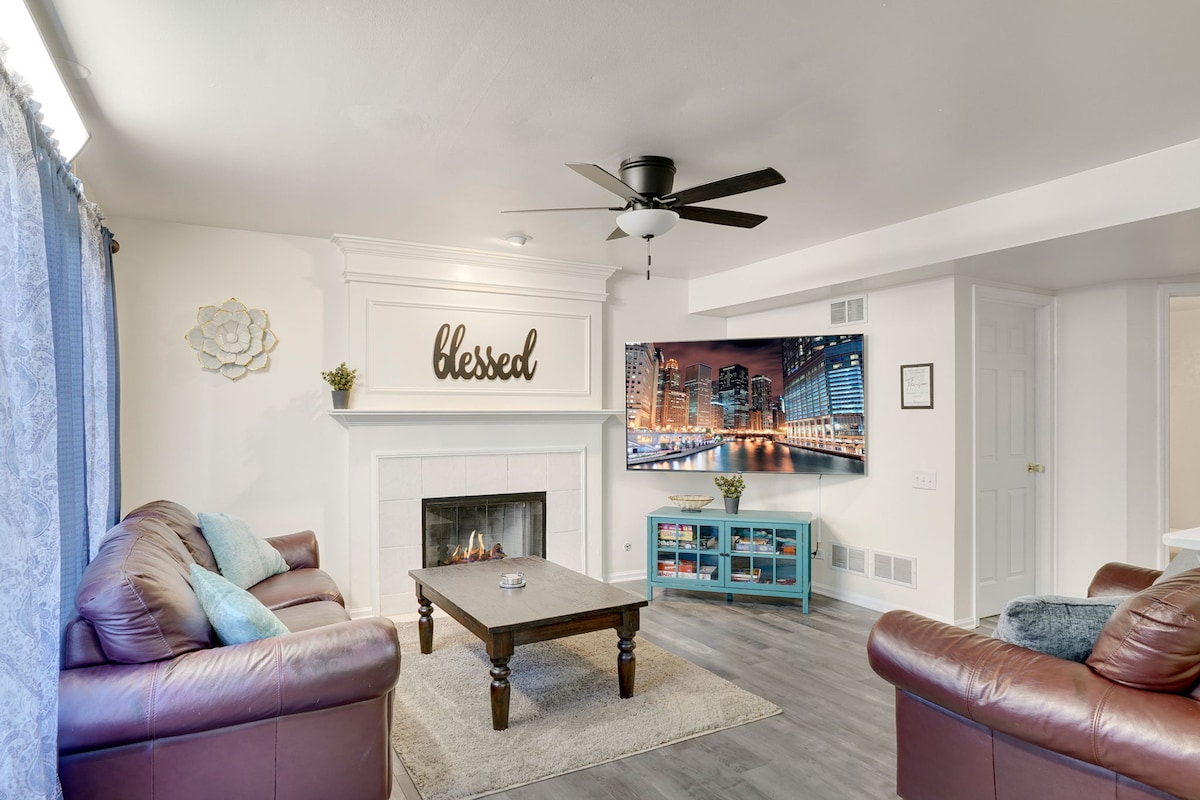 Maison de ranch de 3 chambres et 2 salles de bain dans une impasse calme. Grande cour arrière clôturée pour que les enfants, les chiens et les adultes puissent jouer pendant la journée, puis se détendre au coin du feu la nuit. À distance de marche (50 pieds) du bar/restaurant avec entrée privée. À 15 miles (25 minutes) du centre-ville de Chicago. Et pour vous les couples, rentrez chez vous après votre journée bien remplie, asseyez-vous et détendez-vous dans le bain à remous jacuzzi à 8 jets qui vous accueillera confortablement tous les deux.
