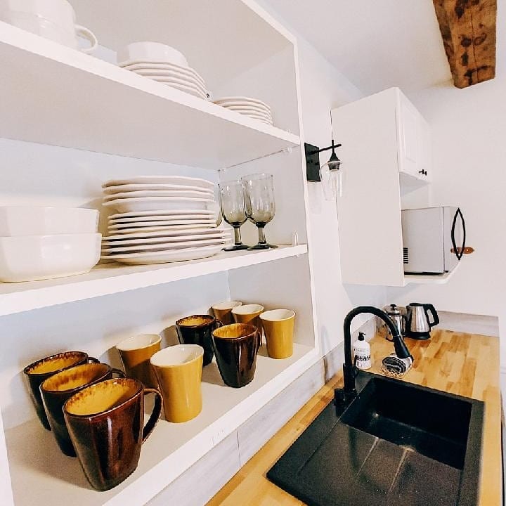 La chambre d'amis dispose d'une entrée séparée située sur un porche arrière couvert avec une petite table et des chaises pour l'été. Il y a de l'air chaud et froid réglable à partir de la pompe à chaleur murale. La petite alcôve de la cuisine est pratique pour le café ou le thé ou un repas léger (four grille-pain, plaque à induction simple « chaude », chauffe-eau) Nous vivons dans un bâtiment historique. Notre quartier est très proche de la Rte 100. Le village de Waterbury et Stowe sont également à proximité avec le ski, la randonnée et le vélo.