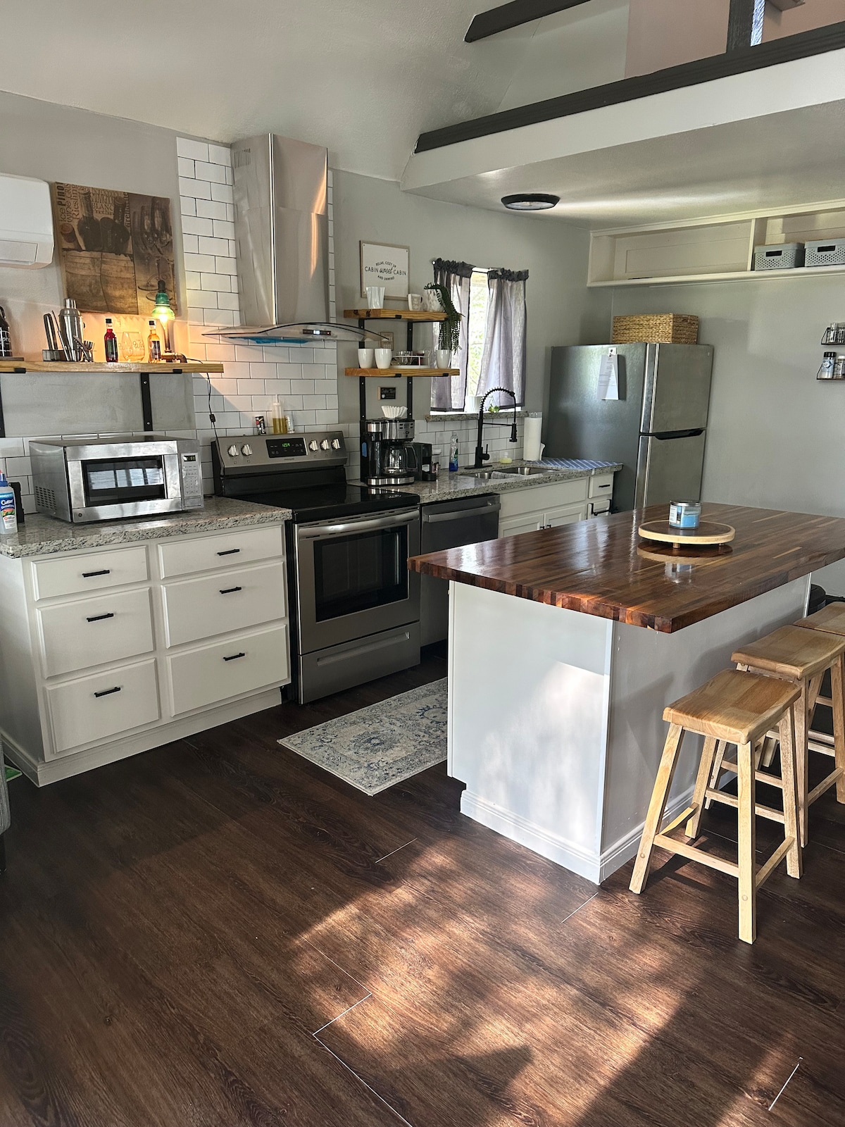 A Hot Tub, The Big Texas Sky, And a Doggy Play Yard for Your Best Friend. Make memories that last & enjoy the relaxation of our premium 600 Sq Ft tiny home. This little home sleeps 5 with a King bed in the main bedroom. A luxury pullout Queen in the living room & a Twin pull-out for extra room. The fully equipped kitchen is perfect to whip up your gourmet meals. It also has a private hot tub tucked on the back of this quiet retreat. Perfectly located next to our glistening stocked pond.