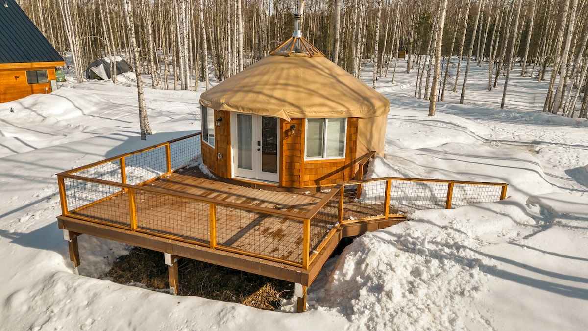 Ce chalet tipi moderne nouvellement construit offre une opportunité d'hébergement unique et luxueuse. Il dispose d'un lit King Size confortable avec des draps impeccables, d'une entrée sans clé, d'un lave-linge et d'un sèche-linge, d'un foyer au gaz, d'une télévision, d'une connexion Wi-Fi, d'un jacuzzi et de grandes fenêtres pour que vous puissiez profiter de la vue magnifique sur l'Alaska tout en étant entouré d'une forêt tranquille. La cuisine et la salle de bain sont équipées de tout ce dont vous avez besoin pour vous sentir comme chez vous. Profitez de l'ambiance chaleureuse et confortable pendant votre escapade privée.
