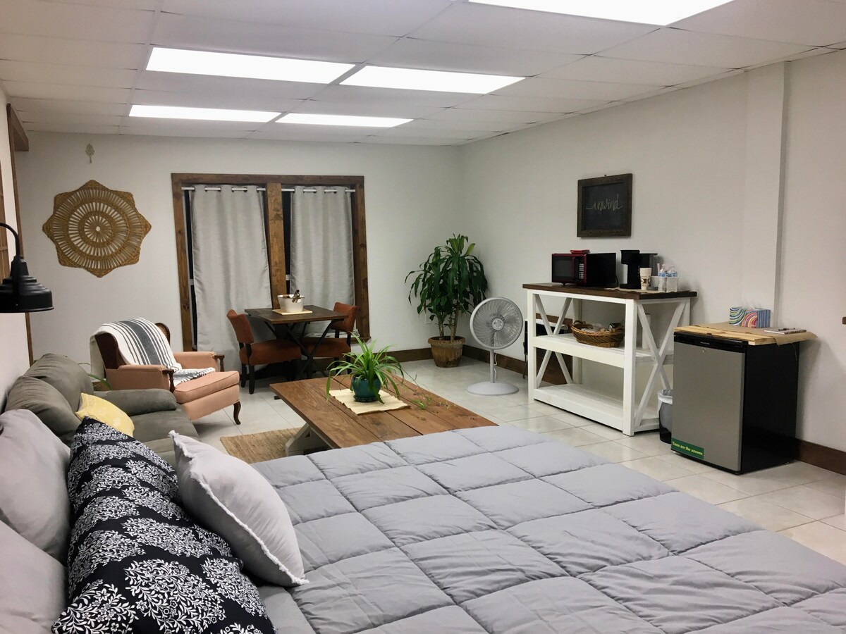 L'est du Texas est connu pour la chasse au trésor, la nourriture réconfortante et les forêts de pins. Le Farmhouse Studio est connu pour son hospitalité de campagne, ses vues sereines et ses nuits confortables. N'oubliez pas votre équipement de pêche pour attraper et relâcher dans l'étang d'un acre ! Venez vous évader de votre quotidien. Convient pour un couple ou une famille avec de petits enfants de moins de 10 ans. Keurig, micro-ondes, grille-pain, mini-réfrigérateur fournis. Foyer, mobilier d'extérieur fourni. Il n'y a PAS de cuisine complète et les animaux ne sont pas autorisés. Préavis de 24 heures requis.