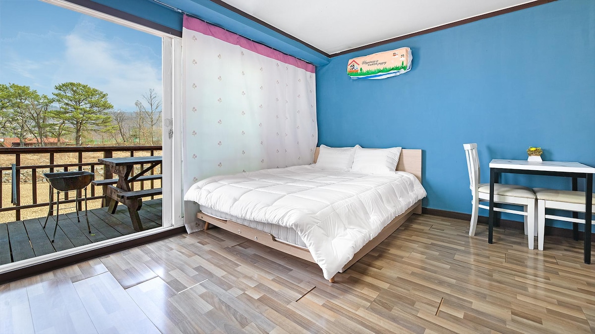Cet espace spécial comprend une maison privée et un espace extérieur spacieux. Tous les espaces ne sont ouverts aux organisateurs que pendant que vous êtes ici pendant que vous êtes ici. Profitez du feu la nuit tout en regardant les étoiles et la lune. Jusqu'à l'aube, vous pourrez profiter d'un espace confortable et d'une musique avec des lumières LED. Quand il pleut, en regardant la vallée, le barbecue dans le bungalow est un autre bonheur. Il y a une aire de jeux et un sentier pédestre, alors ne manquez aucun exercice, comme des sentiers pédestres et des balyards de badminton. Après les sentiers pédestres de Yongmunsan et Jungwon Mountain, plongez vos pieds et profitez de la guérison dans la vallée cristalline à côté de la pension. La salle avec vue sur Vally est une pièce où vous pourrez vous allonger sur le lit et admirer la vallée. La chambre avec vue sur le jardin est une pièce où vous pouvez voir le plus grand espace et le jardin privé et l'aire de jeux ensemble. Selon le nombre de personnes, une seule des deux chambres indépendantes peut être utilisée. Moyennant des frais supplémentaires, les deux chambres peuvent être utilisées seules. Relation dans la nature # Vallée # Fête privée # Barbecue # Fung # Chien