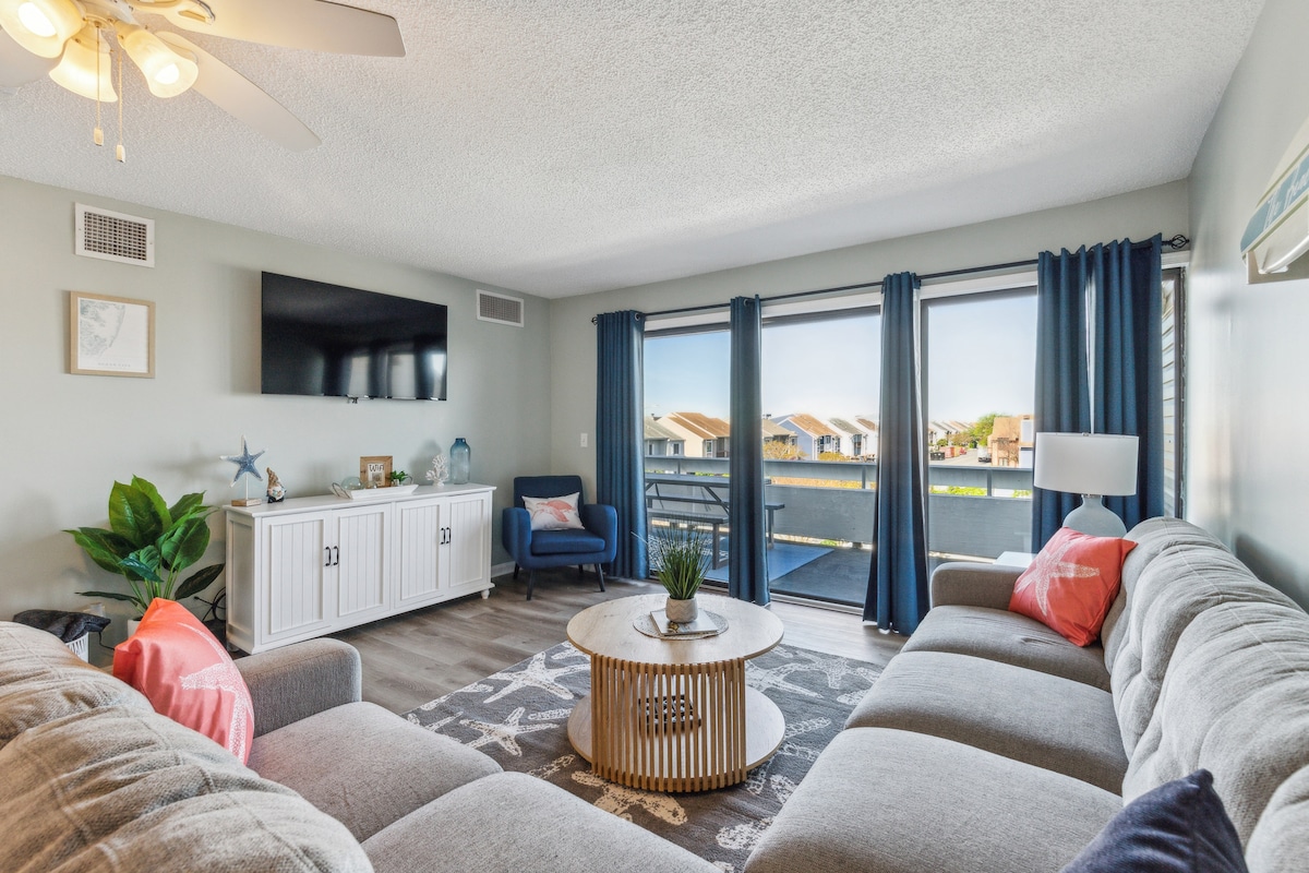 This charming OC studio promises nothing but good vibes! The studio has a full bath, an open layout with an electric fireplace, a fully equipped kitchen, and washer and dryer. Relax on the private balcony, sipping a drink in a hanging chair or dining at the patio table. Proximity to Jolly Roger Amusement Park and Splash Mountain Water Park adds to the excitement, while numerous restaurants and shops are a short stroll away. The beach and boardwalk are just a few blocks from your doorstep!