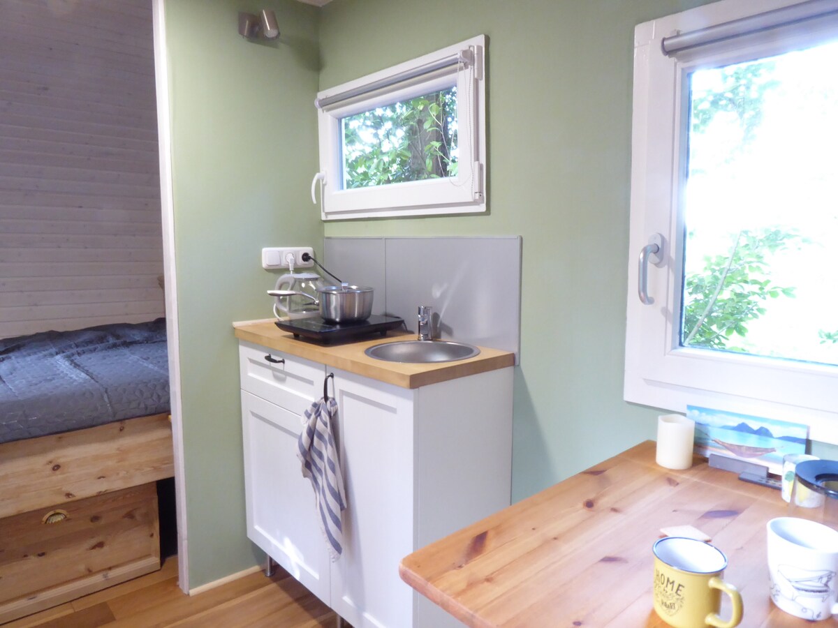 La voiture de construction d'environ 18 m ² offre en été et en hiver un endroit confortable pour deux personnes dans une couchette de 1,40 m de large. Dans la voiture se trouve une cuisine équipée avec 2 plaques, réfrigérateur et eau chaude. Le lit mesure environ 140x200cm avec quelques centimètres 'air' sur la tête et le pied. À côté du wagon de chantier se trouve des toilettes à compost inodores. La salle de bain est située dans notre établissement et doit être partagée avec nous.