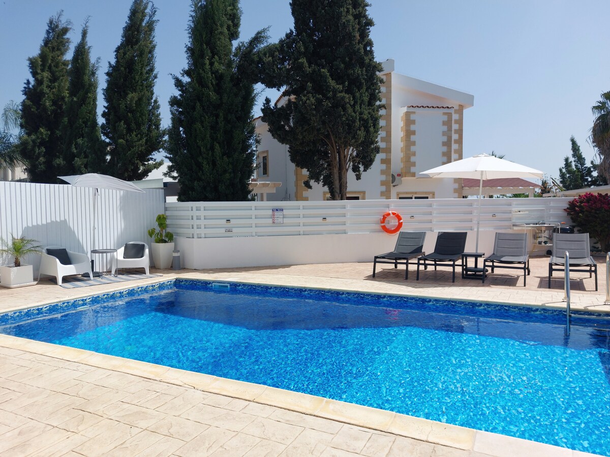 Notre villa est parfaite pour des vacances paisibles et relaxantes. La villa elle-même offre une piscine privée chauffée (avril - novembre), des lits confortables, une connexion haut débit rapide et beaucoup d'espace pour se détendre à l'extérieur et profiter de notre climat plus chaud. L'emplacement est à distance de marche des plages rustiques et préservées d'Ayia Thekla et du joli site fluvial de Potamos. Les belles plages de sable blanc d'Ayia Napa (Landa, Nissi, etc.) sont à seulement 10 minutes en voiture, un endroit idéal pour sortir et explorer Chypre !