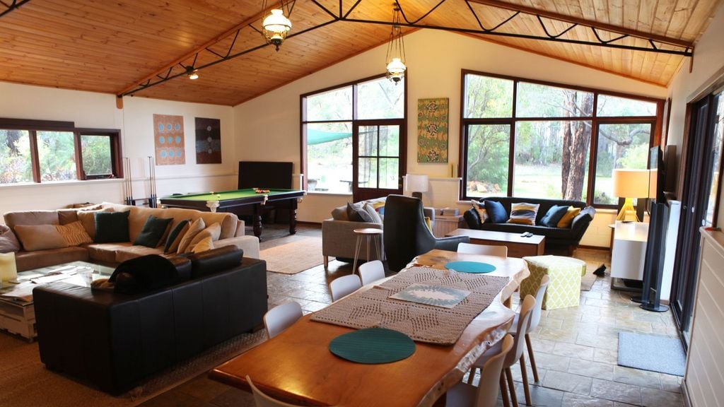 Admirez la vue qui s'étend sur la cime des arbres jusqu'à la baie de Geographe depuis la piscine. Cette propriété respire le caractère et le charme dans un quartier tranquille. Détendez-vous dans un salon de piscine et regardez le monde passer ou rendez-vous à la « grotte des Jeux » pour une partie de billard ou d'arcade vintage. Asseyez-vous dans l'amphithéâtre près de la cheminée pour déguster des guimauves rôties. Amusement infini pour les enfants avec une balançoire dans les arbres, un trampoline, un cadre d'escalade funky de singe et une abondance d'espace et d'air frais et champêtre. Woodbridge Vista est une véritable escapade au sud !