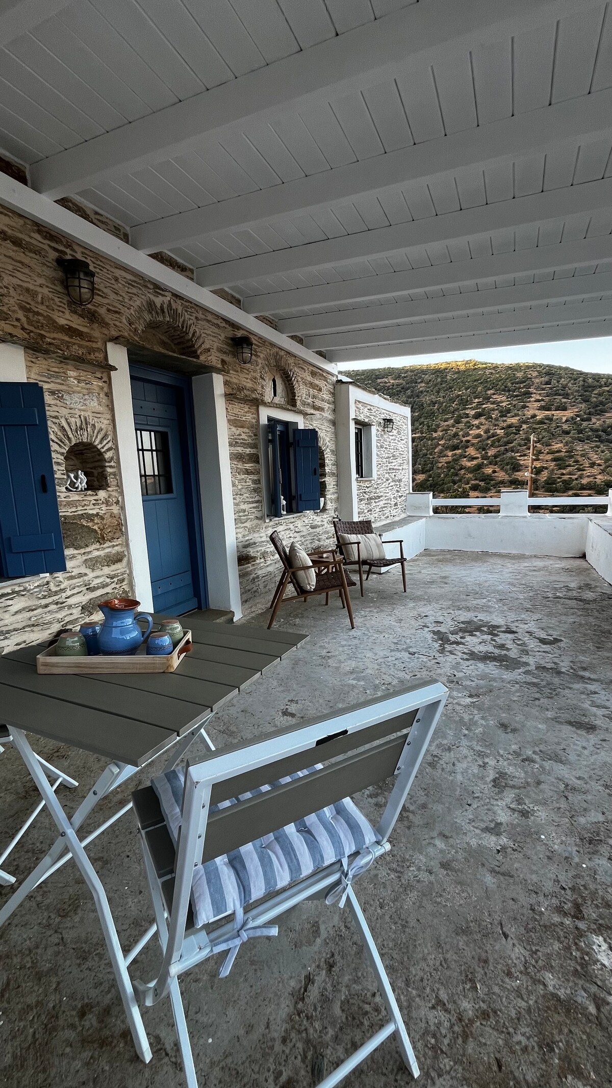 Bienvenue dans notre maison à Andros. Loin des voisins et des zones bruyantes, sur un terrain de 2 acres, elle est idéale pour ceux qui recherchent des vacances paisibles et relaxantes. Elle est spacieuse et agréable, avec des espaces intérieurs et extérieurs confortables et une vue imprenable sur la mer Égée. Elle est située sur la côte sud-ouest de l'île et elle est très pratique pour l'explorer. Elle est idéale pour les familles et les amis qui cherchent à échapper à l'ordinaire.