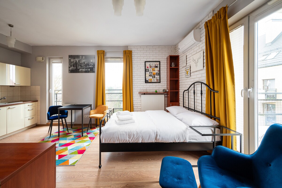 Appartement confortable et entièrement équipé dans un immeuble neuf. Salon avec cuisine ouverte divisé en salle à manger et salon. La chambre dispose d'un grand lit et d'une armoire spacieuse. Il y a aussi un dressing comme espace de rangement supplémentaire. Il y a des magasins, des restaurants et des cafés à proximité Équipement : climatisé, cafetière, bouilloire, fer et planche à repasser, machine à laver Accès depuis l'aéroport Chopin 20 min en taxi 50 min en transports en commun depuis l'aéroport de Modlin 50 min en taxi 120 min en transports en commun