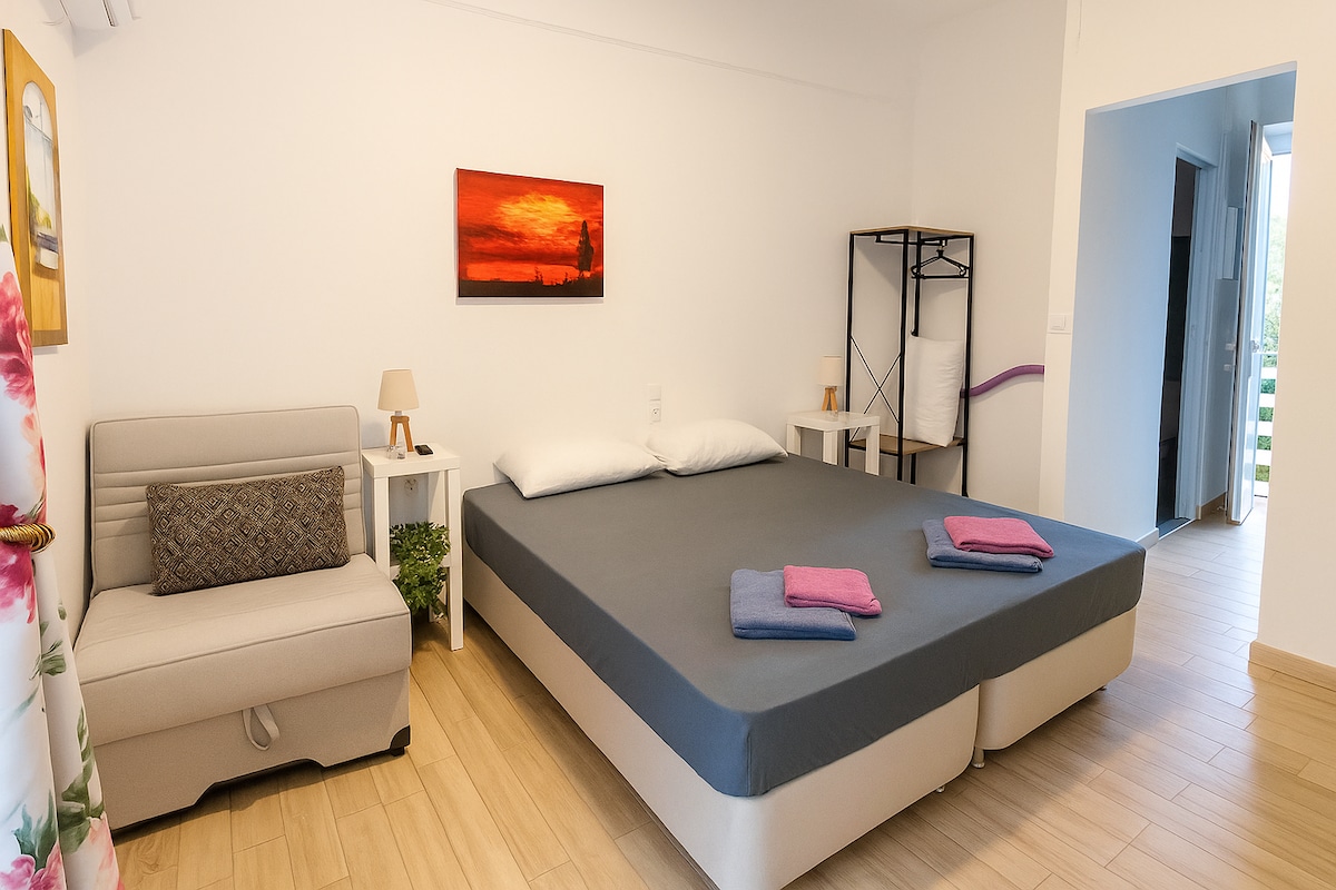 La chambre dispose d'un lit double (180x200cm), d'un lit simple (90X200) et d'un canapé-lit monoplace (85x195cm) . Profitez d'équipements modernes tels qu'une connexion Wi-Fi gratuite, la climatisation et une cuisine entièrement équipée dans un espace qui allie élégance et fonctionnalité. La mer est à seulement 5 minutes en voiture ou à 8 minutes à pied. Veuillez nous informer avant votre départ si vous avez besoin d'un reçu ou d'une facture.