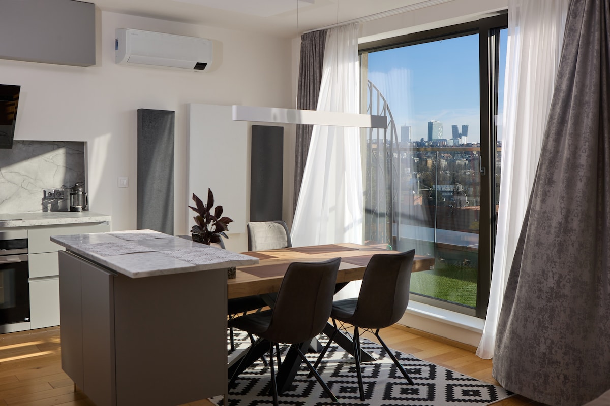 Bienvenue dans notre bel appartement moderne et entièrement équipé (54 m²) avec balcon, situé au 8e étage dans un quartier calme du centre-ville, offrant une vue panoramique sur toute la ville. Cet appartement est idéal pour les voyageurs à la recherche d'une retraite paisible au cœur de la ville, où vous vous sentirez comme chez vous. Un avantage important est l'épicerie située directement dans l'immeuble. Nous parlons plusieurs langues et sommes heureux d'organiser votre séjour à Pilsen.