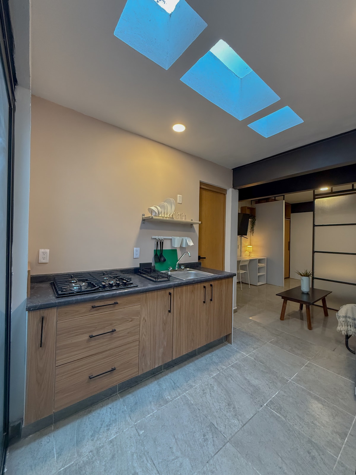 Encantador apartamento en una casona antigua recién renovada, ideal para escapadas románticas o estancias de trabajo. Cuenta con una recámara cama queen size con baño privado, sofá cama para un invitado adicional, una cocina completamente equipada y patio privado. A pasos de Av. Chapultepec, restaurantes, bares y cultura. Atención 24/7, WiFi veloz y detalles de cortesía. Nos distingue el servicio amable y la atención personal Servicios y amenidades de lujo para consentirte y descansar.